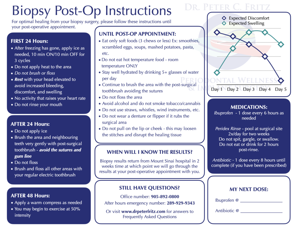 Your biopsy results return from the Oral Pathology laboratory at Mount Sinai Hospital in two weeks time. At which point we will go through the results at your post-operative appointment with you.